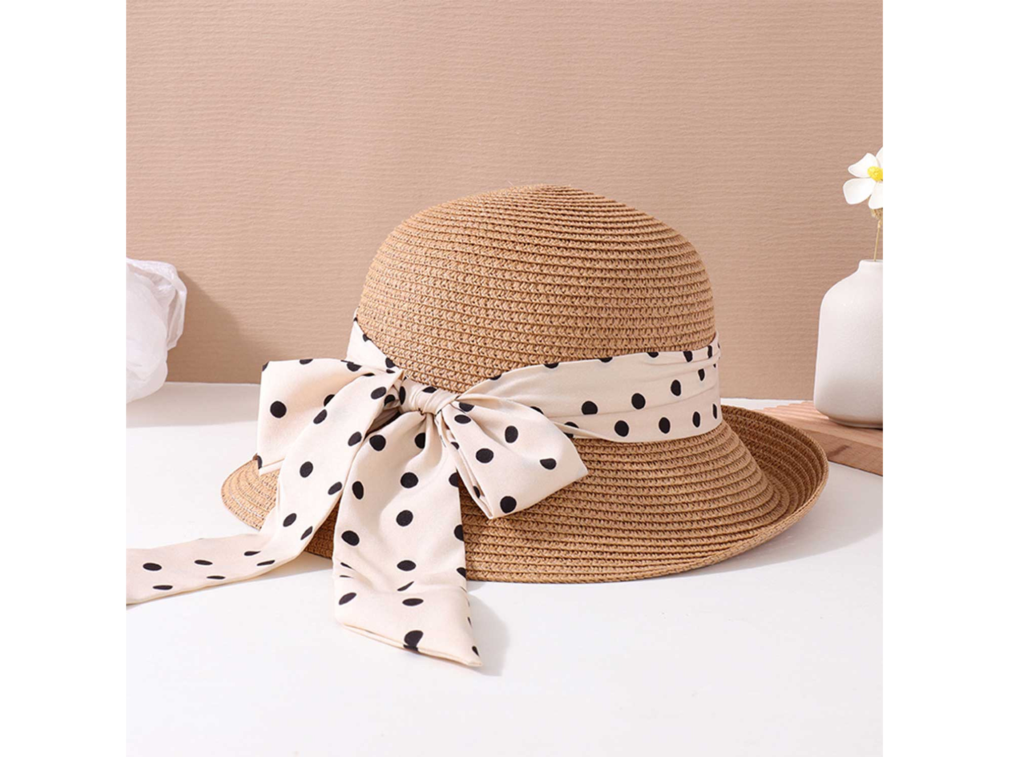 Ամառային գլխարկներ XIMI 6941963960212 POPULAR POLKA DOT BOWKNOT SUNSHADE BRAIDED HAT (KHAKI) (960212)
