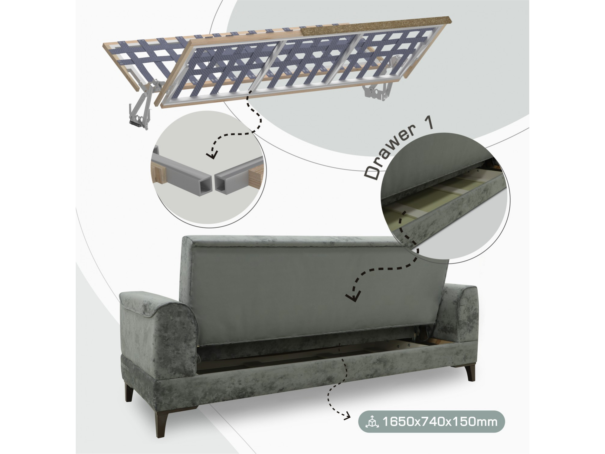 | Каркас | дерево՝ сосна,металлическая рама,ламиниров.ДСП,ДВП |